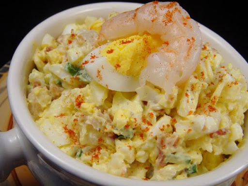 2. Grate or chop eggs and combine with chopped shrimp and crumbled crisp bacon.