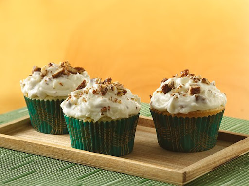 Pipe or spread frosting on top of each cupcake; sprinkle with remaining glazed pecans.