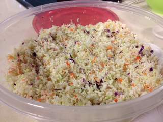 Chop shredded cabbage with carrots to desired size. Combine cabbage/carrot mixture with chopped onions.