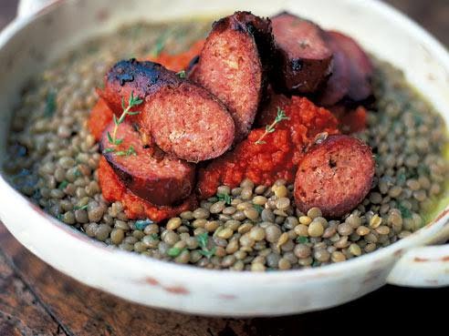 Remove the sausages from the roasting tray and pour away any fat. Tip the lentils into your serving bowls. Remove the cinnamon stick from the salsa rossa and discard it, then season well to taste and spoon it over your lentils. Place 2 sausages, either sliced or whole, on top. Sprinkle with the thyme and serve with a big bowl of steaming broccoli.