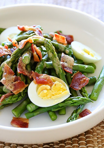 Arrange the asparagus on a plate, top with egg and bacon and drizzle with the vinaigrette. Enjoy!