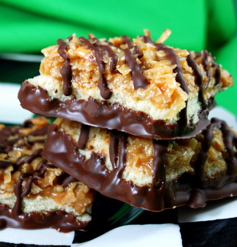 Note: You can simply drizzle chocolate on top of the bars before slicing them up if you’re looking for yet an easier way to finish these off. You won’t need quite as much chocolate as noted above, and you won’t quite get the Samoas look, but the results will still be tasty.