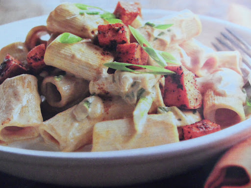 In saucepan, combine peanut butter, cream cheese, chili sauce, and soy sauce. Whisk in 3/4 c. of hot pasta water. Stir over med. heat till heated through. If too thick, stir in additional water. Stir in most of the green onions. Serve sauce over pasta w/ sweet potatoes and remaining onions.
