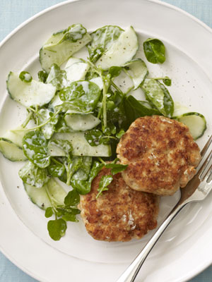 These patties are fabulous alone, but also make for a terrific sandwich when placed on soft rolls or in pita bread. Whichever way you serve them, include the cucumber-watercress salad—it’s a creamy and verdant blend that can’t be beat.