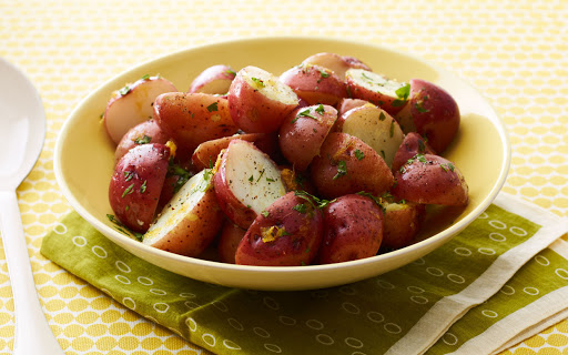 Finely grate zest from 3 lemons into a bowl; press juice from all 4 lemons into a separate bowl. Put potatoes in a pot with lemon juice, garlic, and salt and cover with water by 1 inch. Bring to a boil, then reduce heat to medium-low and cook until just tender, 12 minutes. Drain, transfer to a bowl, and discard garlic cloves.