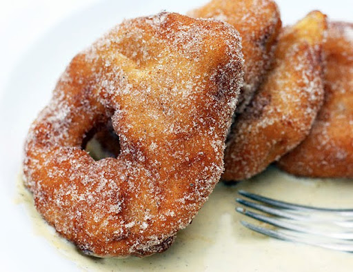 1. Fill a medium sized paper bag with granulated sugar, cardamom, and nutmeg. Set aside. Fill a large, heavy bottomed pot with oil and set over medium-high heat. While oil comes to 350-375 degrees (180 degrees celsius), prepare the pear slices and batter.