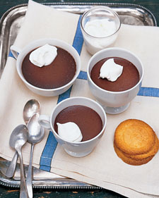 Place six 6-ounce ovenproof cups or ramekins into a roasting pan. Pour chocolate mixture into cups, dividing evenly. Pour enough boiling water into pan so it comes halfway up sides of cups. Cover pan with foil. Cook until custards are barely set, about 25 minutes.