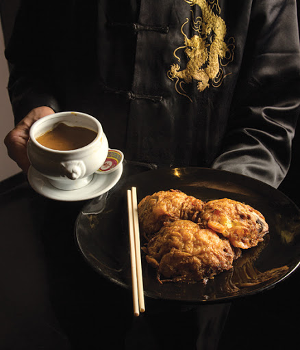 3. Pour canola oil into a 6-quart saucepan to a depth of 2". Heat until a deep-fry thermometer reads 350°. Combine remaining soy sauce, cornstarch, and sesame oil, plus reserved pork, the shrimp, water chestnuts, bean sprouts, scallions, eggs, salt, and pepper in a bowl. Using a ladle and working in batches, gently lower ½-cup amounts of egg mixture into oil; cook, flipping once, until omelettes are puffed and brown, 1½-2 minutes. Using a slotted spoon, transfer omelettes to paper towels. Serve drizzled with reserved sauce; garnish with scallions.