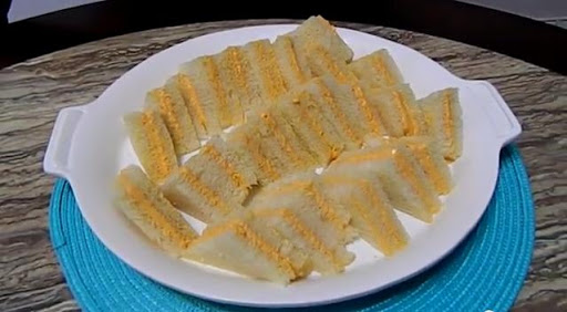 Spread mixture on a slice of bread and top with another slice of bread. Cut into diagonal cuts and cut again crosswise to make 4 triangles for each sandwich.