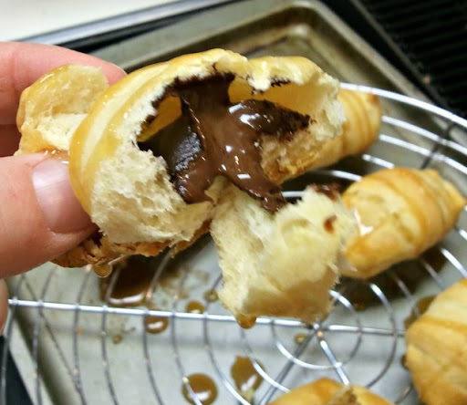 Today’s recipe is a spin off of Tiffany’s Chocolate Croissants. I’m calling them Turtle Crescents! They could be made to look a lot prettier with caramel instead of caramel sauce, and maybe a chocolate drizzle over the top too. The inside however…will keep you coming back for more! That melted chocolate-y goodness, topped with the sweet caramel and crunchy nuts..pretty tasty. The best part is, they can be made quick, fast and in a hurry!