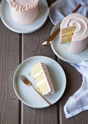 Once there is no longer any heat emitting from the meringue and the bowl is cool, stop the mixer and swap out the whisk for the paddle attachment. With the mixer on medium-low, add in the butter (a couple tablespoons at a time), vanilla, and rose. Turn mixer up to medium-high and mix until silky smooth yet not runny. If the buttercream looks slightly "curdled," just keep mixing. It should take about 5 minutes to finish mixing. Add in pink food coloring, if desired.