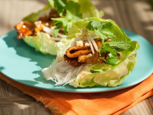 Serve the pork family style in lettuce cups topped with chopped peanuts, mint, cilantro, bean sprouts and Sriracha and the rice noodles on the side.