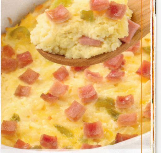 1. Layer 1/3 of potatoes, ham, onion, green peppers