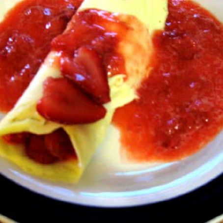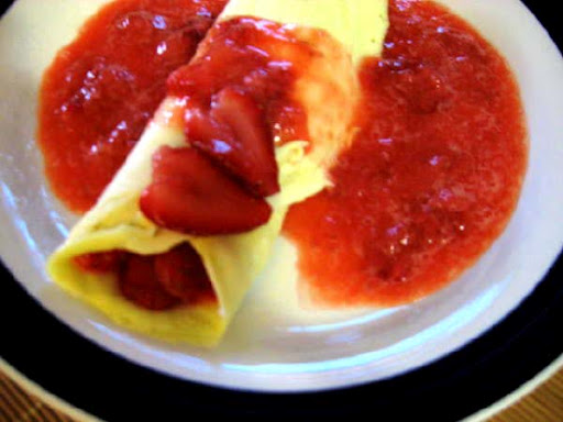 Cook the egg mixture in a dry non-stick skillet, flipping it once, so it cooks all the way through. Line the sliced strawberries down the middle and pour the mashed strawberry syrup on top. Sweeten the strawberry syrup as desired.