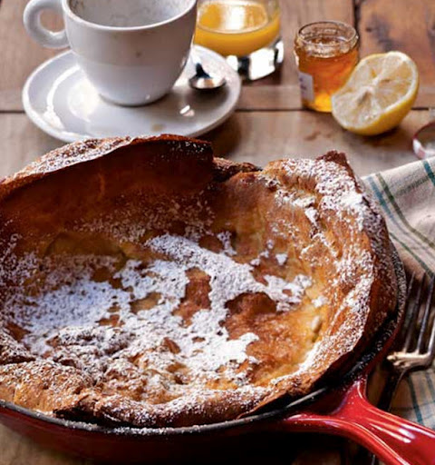 6. Fill a small sieve or strainer with confectioners’ sugar and shake it over the Dutch baby until the surface is thickly covered. Place the Dutch baby in the middle of the table with some little bowls of toppings: lemon wedges, fruit compote, pats of soft butter, maple syrup. You don’t need a knife and a cake lifter for this: just let everybody pull pieces off with their fingers. I guarantee it will disappear FAST.