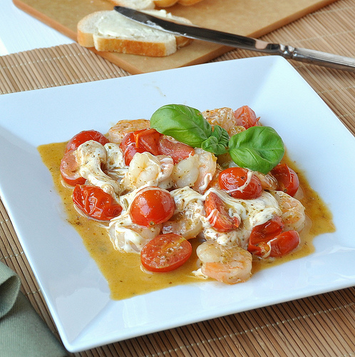 Add all of the ingredients to a large saute pan on medium-high heat. Stir to spread the melting cheese. Cook for about 2 minutes, just until the tomatoes are tender and the mozzarella is nice and creamy. If you are using previously frozen shrimp you only need to reheat them, so don’t over cook!