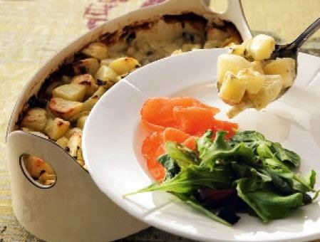 3. Tillaga mitt i ugnen ca 20 min tills potatisen är mjuk och gratängen fått fin färg. Potatisgratängen passar till allt kallskuret kött, till rökt och gravad fisk samt till kyckling.