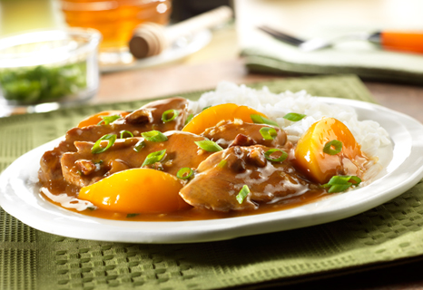 Return the pork to the skillet. Stir in the peaches. Reduce the heat to low. Cook until the pork is cooked through. Stir in the pecans. Serve the pork and sauce with the rice. Sprinkle with additional sliced green onion, if desired.