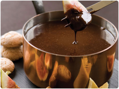 5. Slowly add the Kahlúa to the chocolate and cream mixture and serve hot with assorted fruit and biscuits for dipping.