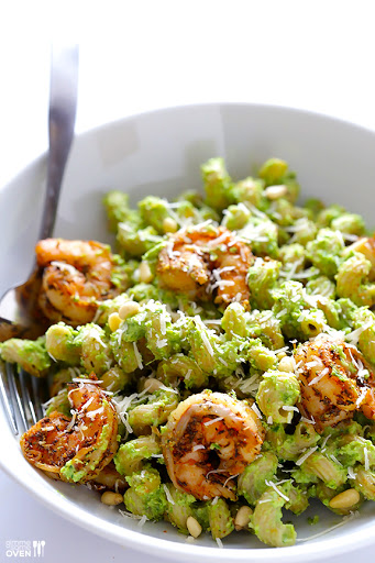 When the pasta is al dente, reserve 1/2 cup of the pasta water then drain the pasta. Return the pasta either to the stockpot where it was cooked, or to the saute pan (with the stove heat turned off). Add the pesto to the pasta, and toss until evenly coated, adding in a bit of the reserved pasta water if needed to thin the pasta. Then stir in the shrimp and pine nuts, and serve immediately sprinkled with some extra Parmesan cheese.