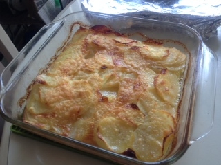 Peel potatoes and thinly slice (1/8” if using a mandolin). Toss with butter, Salt & Pepper. Spread evenly in a 2 quart baking dish and add broth. Cover tightly with foil and bake 30 minutes. Uncover and bake until top is well-browned and most of stock is absorbed (30-35 minutes more.