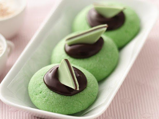 - 18 thin rectangular crème de menthe chocolate candies, unwrapped, cut in half diagonally (Andes)