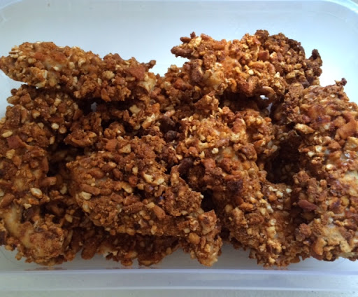 5) Line a baking sheet with parchment paper. Working with one piece at a time, dip the chicken into the buttermilk mixture and shake off excess. Then dredge in the flour. Next dip into the beaten eggs and shake off excess. Finally dredge in the pretzel mixture and place on the baking sheet. Repeat this process for half of the chicken. Refill the flour and pretzel containers and continue the process for the remaining cookies.