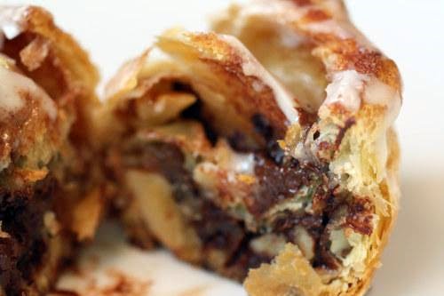 Pain au Chocolat Cinnamon Rolls with Crème Fraîche Icing and Walnuts