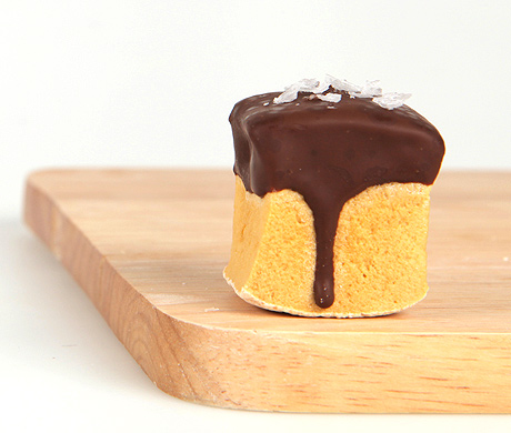 In a dry metal bowl set over a pan of barely simmering water, melt the chocolate and shortening, stirring until smooth. Working with one marshmallow at a time, brush the marshmallow again to remove any excess confectioners' sugar then dip one smooth side about 1/4 inch into the chocolate to coat it, scraping any excess chocolate on the edge of the bowl. Sprinkle the chocolate-covered side of the marshmallow with a few flakes of sea salt, then transfer, chocolate side up, to a wire rack set over a baking sheet and let stand until the chocolate is set. DO AHEAD: Marshmallows—without chocolate—can be stored, layered between sheets of wax paper or parchment in an airtight container in a dry place at cool room temperature, for 1 month. Chocolate-dipped marshmallows can be stored in the same manner, but will only keep for about 2 days.