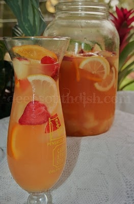 Just before serving, add in the 7-up and stir. Fill individual glasses halfway with ice, scoop out some of the fruit, then add more ice. Pour the sangria in and top off with a garnish of a fresh strawberry or a fresh slice of lemon or orange. Toss a cherry or two on top and serve!