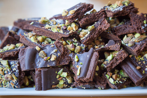 6. Once the cookie is done baking, pull it out and pour the chocolate over the top of the warm cookie. Using a spatula or knife, evenly spread the chocolate all the way to the edge of the cookie dough. Sprinkle the chopped pistachios and sea salt evenly over the chocolate. Let cool in the pan, on a wire rack, until room temperature. Slice into 1-inch strips then break cookie pieces by hand or cut into squares.
