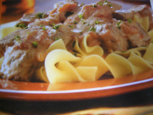 Discard bay leaf. Just before serving, stir in sour cream; heat through. Serve w/ noodles. Sprinkle w/ parsley if desired.