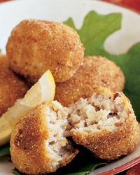 In a small saucepan, heat 1/2 inch of vegetable oil until shimmering. Fry 4 croquettes at a time, turning twice, until golden brown, about 3 minutes. Transfer the croquettes to a wire rack set over a baking sheet and keep warm in the oven while frying the rest. Serve immediately, with lemon wedges.