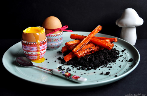 5. Transfer eggs to egg cups and serve it with edible soil and carrot fries. Use a butter knife to have a quick and firm tap at the side of your egg to crack it, before lifting the knife to remove the top of the egg. Then sprinkle the eggs with salt and black pepper to taste. Dip carrot fries into runny yolks and bread it with bittersweet edible soil. Time to gormandize!
