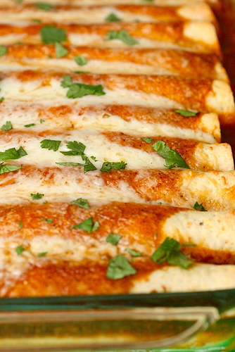 Reduce the oven temperature to 400˚ F. Remove the enchiladas from the oven and pour the sauce oven the top. Sprinkle with the remaining shredded cheese. Cover the dish with foil and bake for 20 minutes.