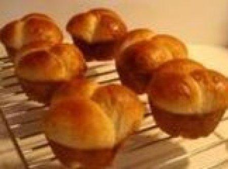 Grease a baking pan or muffin cups. To bake, shape into desired amount of rolls (cloverleaf rolls, Parker House rolls, or crescent-shaped rolls) and shape dough into tight balls). As you shape the rolls, you want to stretch the top of the dough ball while simultaneously sealing the bottom. The stretching helps the dough hold up to the expansion that occurs in the oven, while the sealing prevents the rolls from opening up while baking and becoming wrinkled and doughy on the bottom. As you work, keep the rest of the dough pieces covered with plastic wrap so they will not dry out.