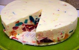 Mix the Dream Whip with the lemon Jell-O done previously. Gently fold in the three colors of Jell-O cubes. Spoon into 9-inch springform pan. Chill at least five hours or overnight.