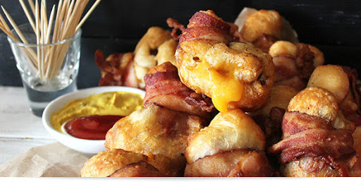 For the Baked Version: Heat oven to 400°F. Place bacon on foil-lined cookie sheet with sides. Bake about 8 minutes to partially cook bacon. Wrap each stuffed “bomb” with 1 slice partially cooked bacon slice. Place bacon wrapped dough 2-inches apart on two foil-lined cookie sheets with dough seam side down. Bake 13 to 15 minutes or until golden brown. Serve warm with ketchup and mustard, if desired.