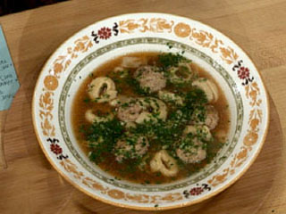 To make sure the meatballs are cooked through, split one open and make sure there is no pink left in the meat. To serve, ladle some of the broth with dumplings and tortellini in to a shallow bowl and top with a sprinkle of the parsley mixture and some Parmigiano.