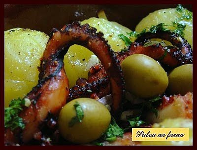 Bañamos el fondo de una fuente para horno grande (a poder ser de barro) con aceite de oliva y ponemos el pulpo y las patatas cocidas encima, el perejil y el ajo picaditos, sal, pimienta y las aceitunas sin hueso, lo regamos todo el Oporto y con un chorrito más de aceite de oliva. Metemos la fuente en el horno 15 minutos.