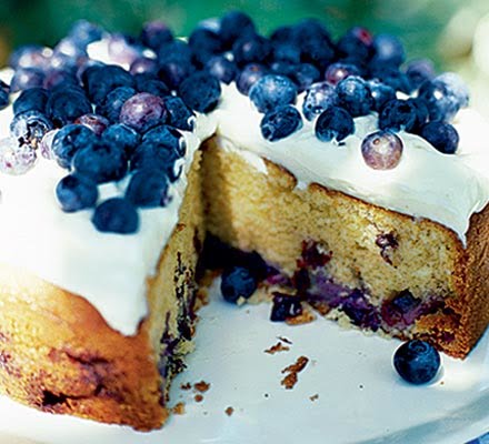 To make the frosting, beat the soft cheese with the icing sugar and the remaining soured cream in a bowl until smooth and creamy. Spread over the top of the cooled cake (don't be impatient as the frosting will melt if the cake is too warm) and scatter with the remaining blueberries. The cake will keep in the fridge for a couple of days. Bring it to room temperature for about an hour before serving.
