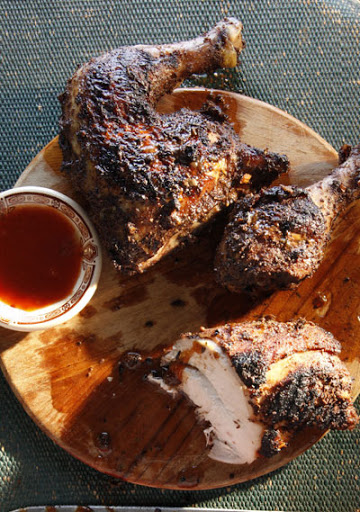 2. Build a medium-hot fire in a charcoal grill or heat a gas grill to medium. (Alternatively, heat a cast-iron grill pan over medium-high heat.) Add chicken, skin side down; cook, turning once, until marinade forms a crust on the outside, about 8 minutes. Cover grill; continue cooking until cooked through, about 40 minutes. (Alternatively, transfer chicken to a foil-lined baking sheet; bake in a 350° oven until done.)