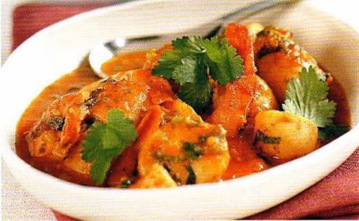 Stir in the prawns and heat briefly until they are warmed through. Do not overheat the prawns or they will quickly shivel, becoming tough and tasteless. Spoon into shallow bowels and serve sprinkled with the remaining cilantro, torn into pieces.