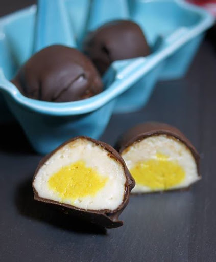 Wrap the white filling around the yellow filling, and roll it into a ball, as pictured above. Repeat with the rest of the mixture, creating about 8 small eggs. Place in the freezer to set until firm.