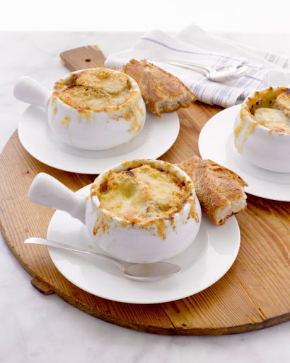 Ladle 1 cup hot soup into four 13-ounce ramekins or ovenproof bowls. Arrange the bowls on a rimmed baked sheet. Place 2 slices of toasted bread over each bowl of soup to cover the surface of the soup completely. Sprinkle 3 ounces grated cheese over bread in each bowl, and place under broiler until cheese is melted and crusty brown around the edges. Watch carefully that bread doesn't burn. Serve immediately.