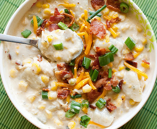 6.Reduce heat to low and simmer for 12-15 minutes or until the potatoes are tender. Add corn (If using fresh corn, cut from the cob with a sharp knife. Use the back of your knife to release the pulp from the cob.), chicken, and green chiles. Cook over low heat until heated through, about 5 minutes. Garnish with scallion greens, bacon, and cheddar cheese.
