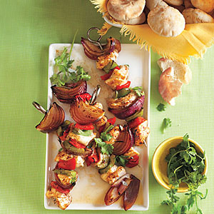 3. Preheat broiler, placing a rack about 5 inches from heat source. Line a large, rimmed baking sheet with foil; mist foil with cooking spray. Thread chicken and vegetables onto 4 metal skewers. Place on baking sheet and broil until chicken is cooked through and vegetables are tender, turning often, about 12 minutes total.
