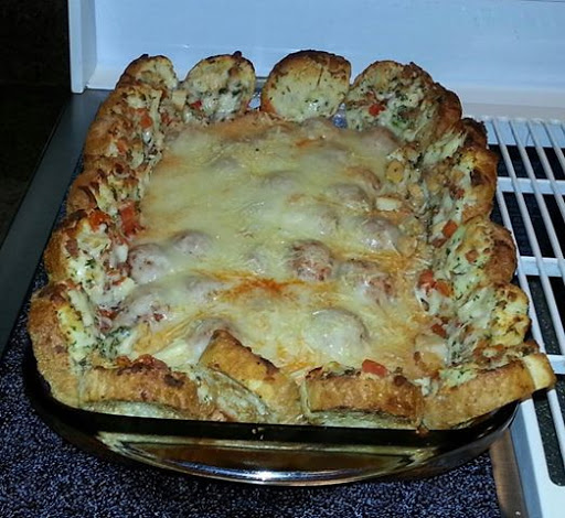 Take the slices of Italian bread and line the pan all the way around with them so that they are kind of keeping the meatballs toward the center of the pan. The bread slices will be standing up in the pan as shown in the picture. You have creative freedom here with the bread...you can lightly butter and garlic the bread prior to placing it in the pan if you prefer or even brush lightly with olive oil and garlic.