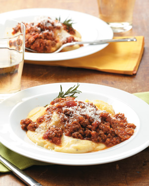 Stir in tomato paste and cook 1 minute. Stir in red wine and cook 1 minute. Add broth, tomatoes, basil, and oregano; reduce heat to a simmer and cook 15 minutes. Serve over Creamy Polenta.