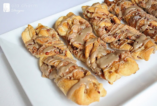 Brush each rectangle with melted butter. Sprinkle 1 tablespoon pecan-sugar mixture evenly over each rectangle; press in lightly. Starting at longer side, roll up each rectangle; pinch edges to seal.